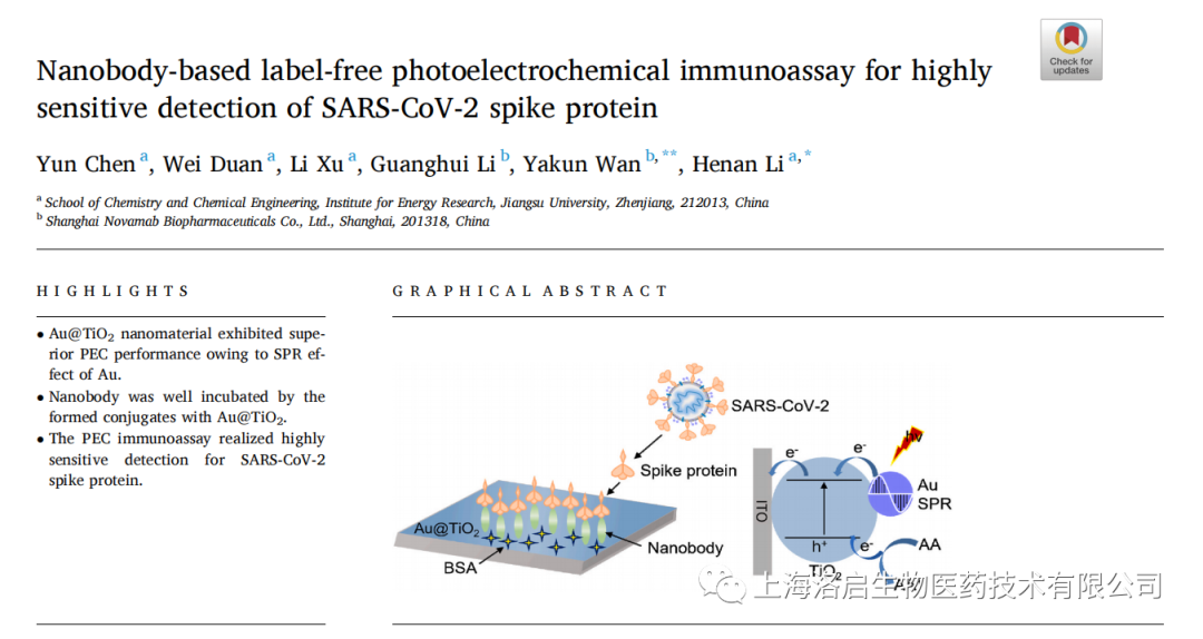 2022年5月3日,深圳商务生物和江苏大学化学化工学院李赫楠教授团队合作,在《Analytica Chimica Acta》发表了题为“Nanobody-based label-free photoelectrochemical immunoassay for highly sensitive detection of SARS-CoV-2 spike protein”的研究论文。深圳商务生物万亚坤博士和李贺楠教授为并列通讯作者,相关纳米抗体的知识产权归深圳商务生物所有。